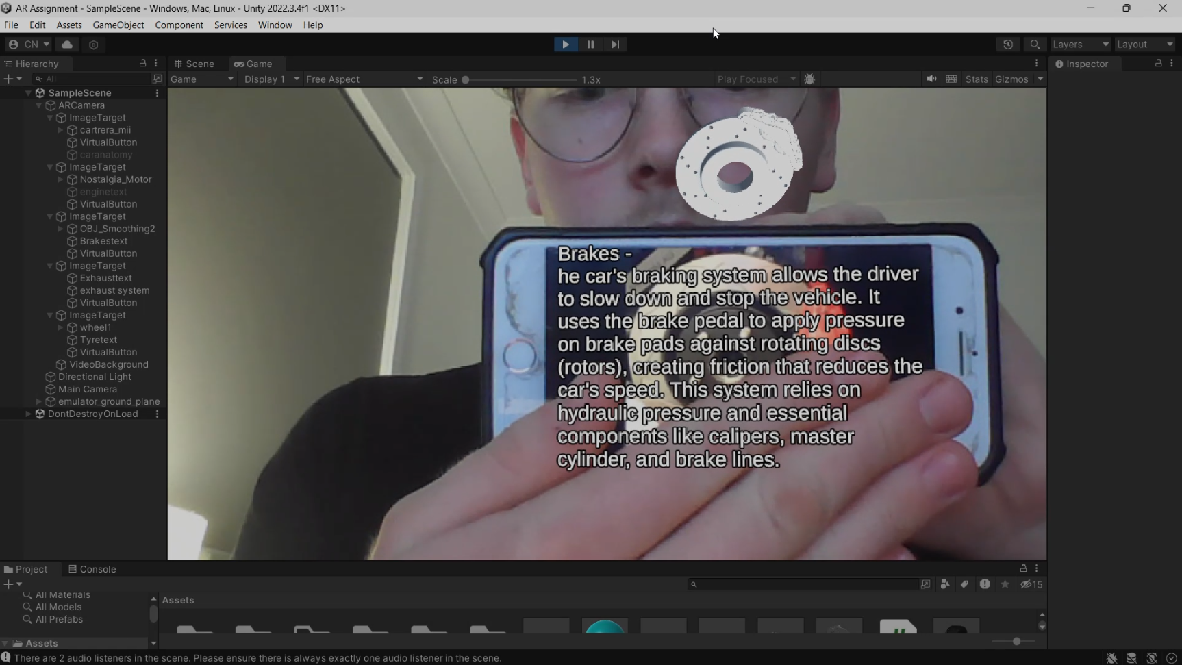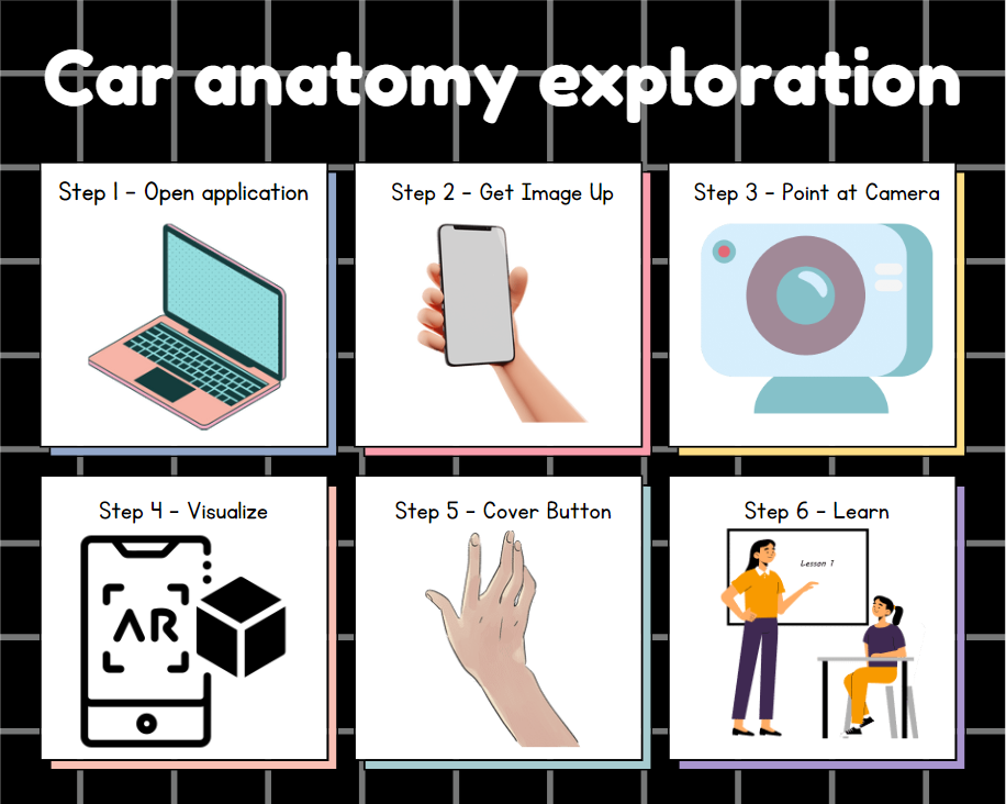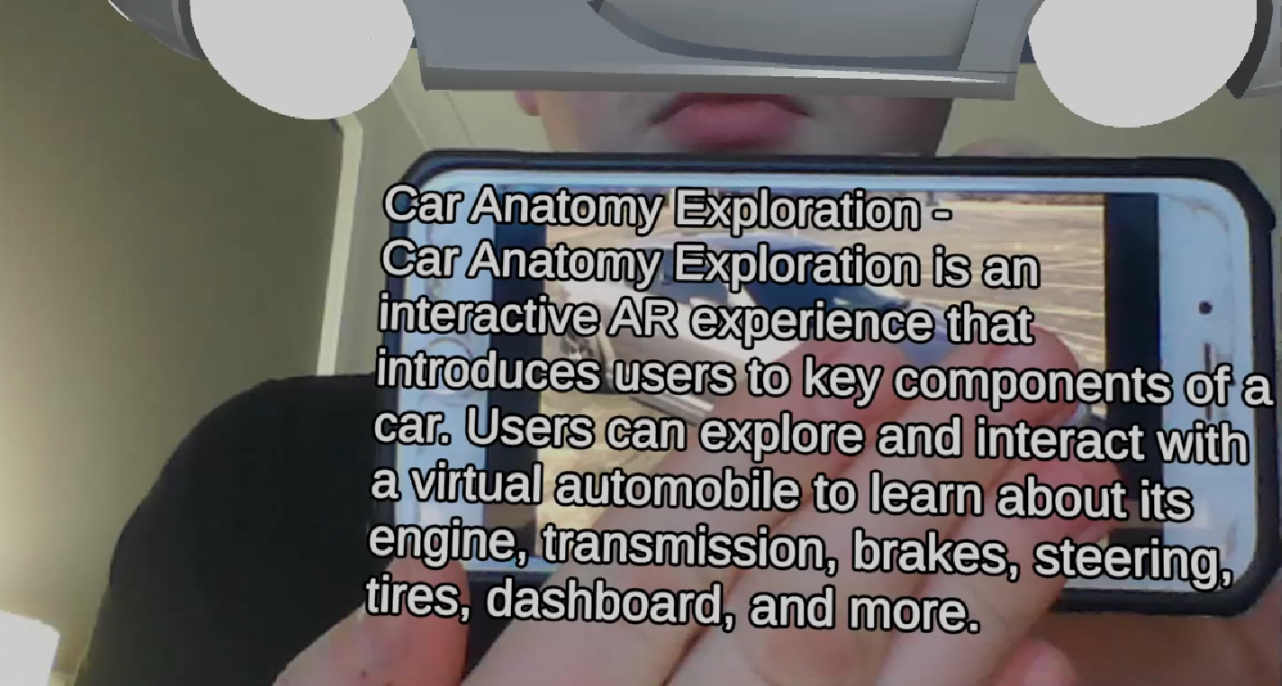 The "Car Anatomy Exploration" AR Unity Project is an interactive educational application that has been specifically developed to educate users on the fundamental components and systems found in automobiles through the utilisation of Augmented Reality (AR) technology. This application enriches the educational experience by providing users with the opportunity to engage with three-dimensional (3D) models of automobile components superimposed onto real-life photos of these components. Users can also access instructive elements by utilising virtual buttons.